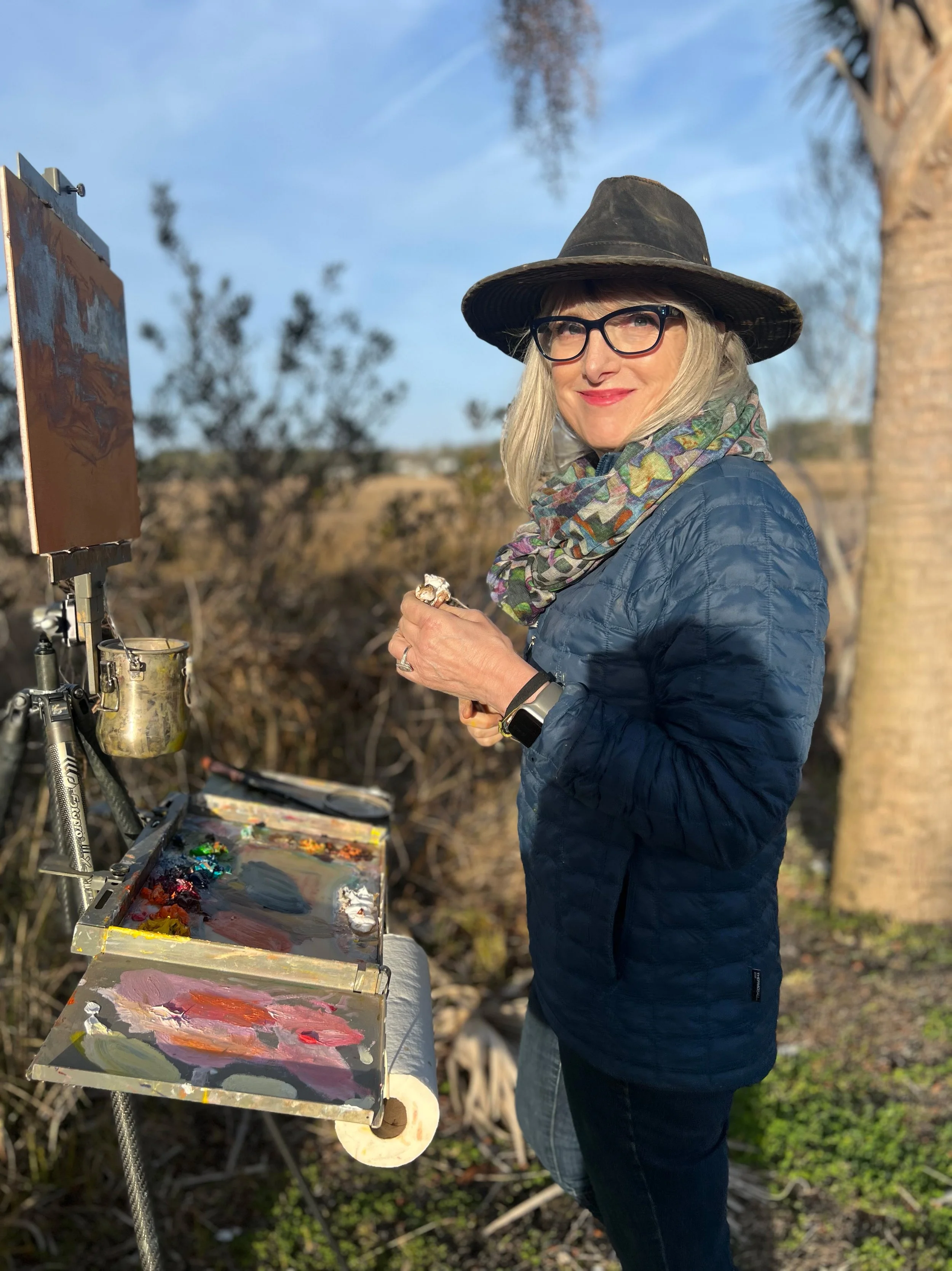 “As an oil painter working en Plein Air, I respond to the shifting light and atmosphere. My knives and brush work reflect not just what I see, it’s that emotional experience! I want to share with the viewer.”